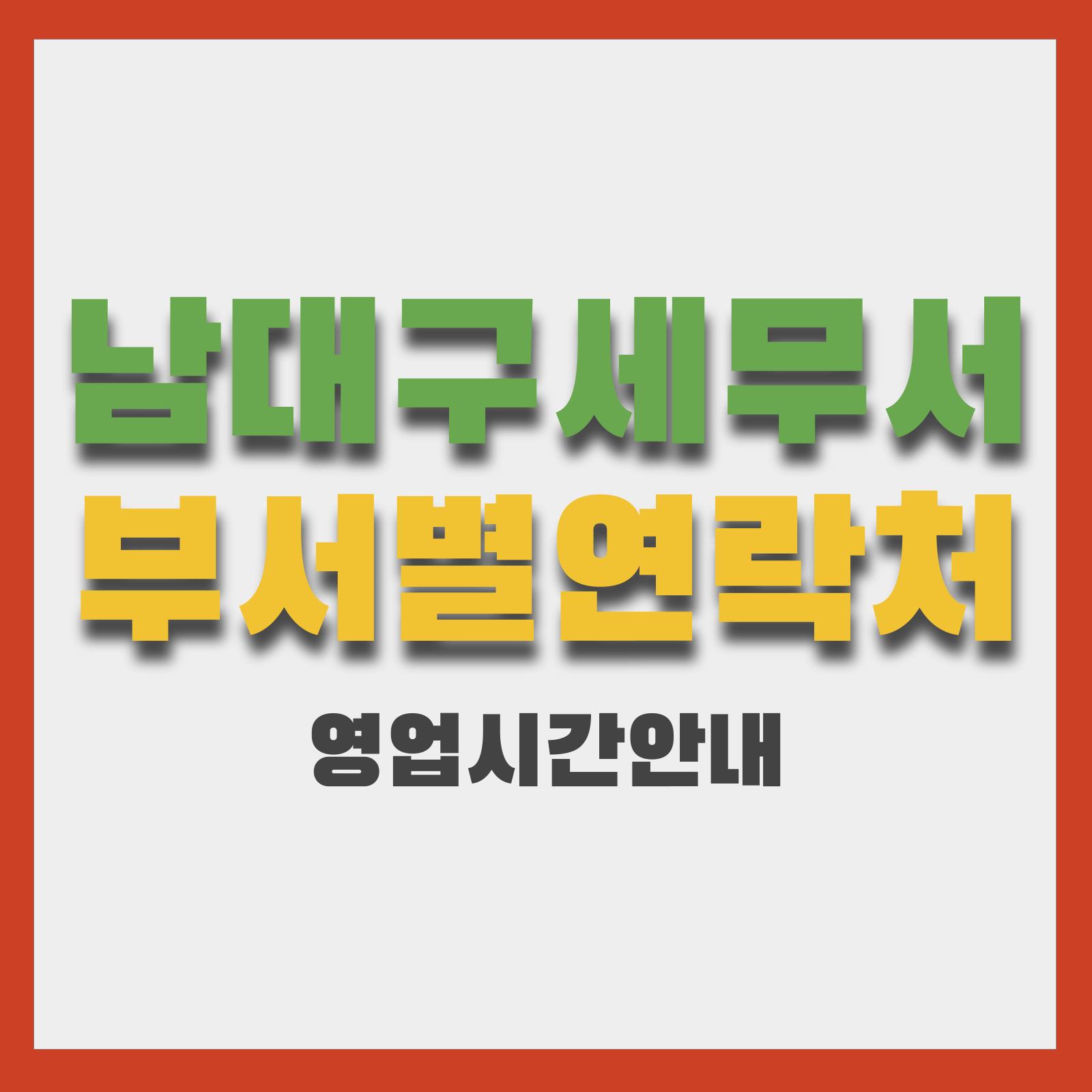 남대구세무서에 관한 본문 정보는 남대구세무서 및 국세청 공식 안내를 기반으로 정리하였습니다. 민원 처리나 신고 절차는 관련 법령·제도 변경에 따라 달라질 수 있으므로, 중요한 신고·납부는 방문 또는 온라인 접수 전에 남대구세무서 공식 홈페이지 또는 홈택스에서 최신 안내를 확인하시기 바랍니다. 긴급한 사항이나 세부사례 상담은 126(국세상담)이나 남대구세무서 대표번호(053-659-0200)를 이용하십시오.