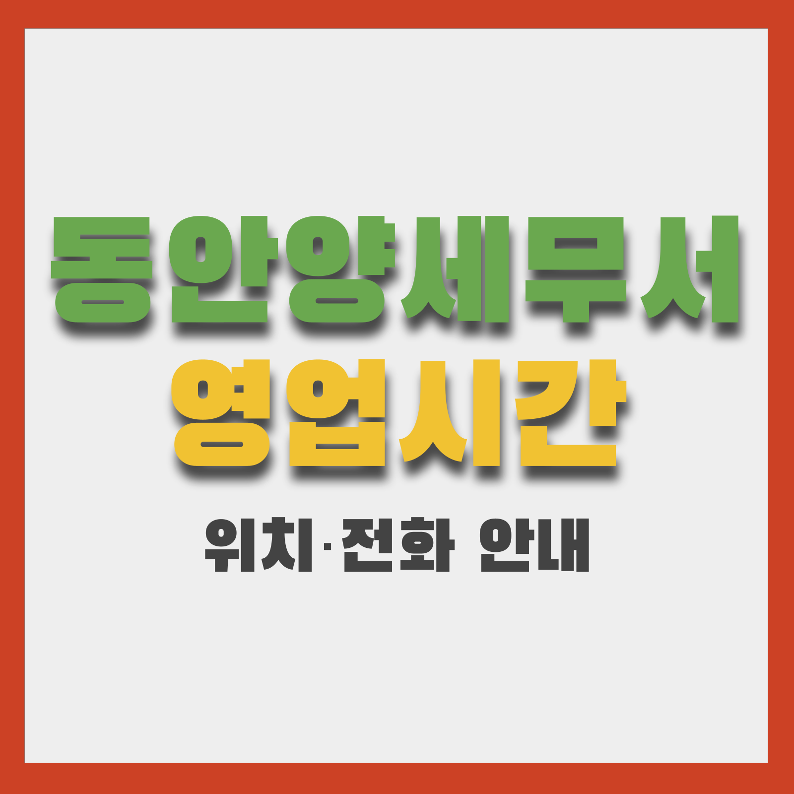 동안양세무서는 경기도 안양시 동안구와 인근 지역에 대한 국세 업무를 담당하는 공공기관입니다. 이 글은 동안양세무서의 위치(주소), 대표전화 및 부서별 전화번호·팩스·전자팩스, 영업시간, 관할구역과 오시는 길, 층별 안내 및 홈택스·민원 활용 팁까지 한눈에 확인할 수 있도록 정리한 안내문입니다. 하단의 표와 링크를 통해 빠르게 필요한 부서 연락처를 확인하세요.